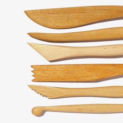 These six different modelling sticks are each 15 cm long and made of sanded and polished birch wood. They are intended as tools for working on water-based, clay-like and ceramic modelling compounds. That both ends of the tools can be used is particularly practical. In this way, there are actually a total of 12 tips available for your use. This of course increases the designing possibilities but can also save time because instead of having to set one tool down to pick up another, in many instances you can simply turn the tool around in you hand and keep right on working!